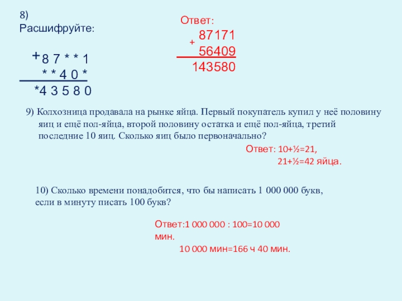 9) Колхозница продавала на рынке яйца. Первый покупатель купил у неё половину
