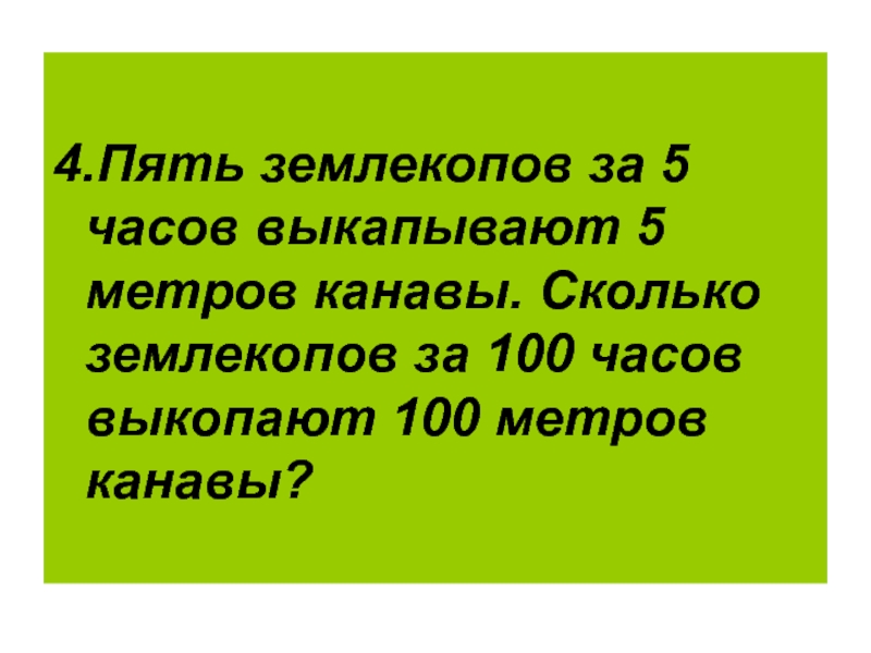 4.Пять землекопов за 5 часов выкапывают 5 метров канавы. Сколько землекопов за 100 часов выкопают 100 метров