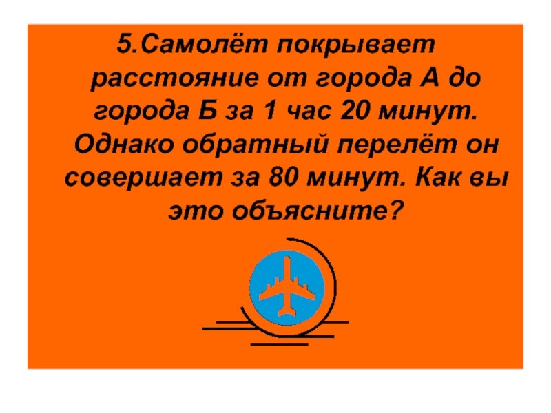 5.Самолёт покрывает расстояние от города А до города Б за 1 час 20 минут. Однако обратный перелёт