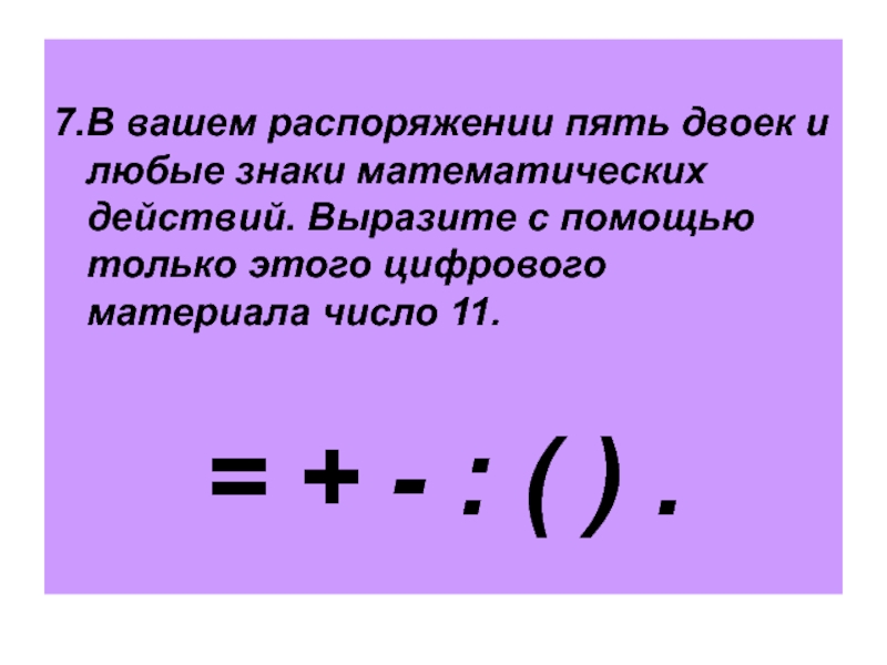 7.В вашем распоряжении пять двоек и любые знаки математических действий. Выразите с помощью только этого цифрового материала