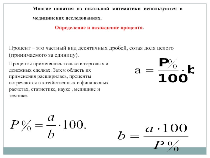 Проценты применялись только в торговых и денежных сделках. Затем область их применения расширилась, проценты встречаются в хозяйственных и финансовых расчетах, статистике, науке , медицине и технике.