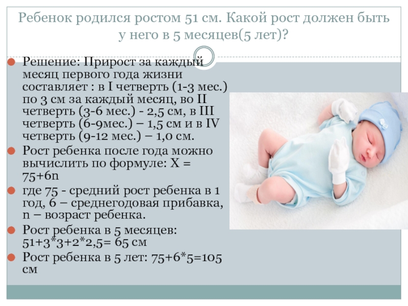 Рост ребенка в 5 месяцев: 51+3*3+2*2,5= 65 см
