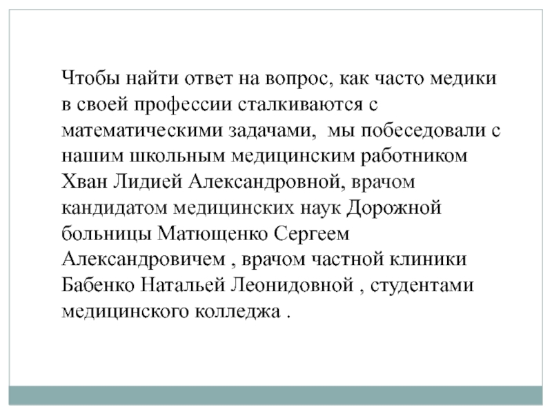 Профессия врача непрерывно связана с математикой. Без математики было бы невозможно проводить расчёты, осмотры, ставить диагнозы, проводить лечение.