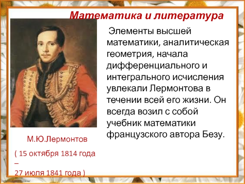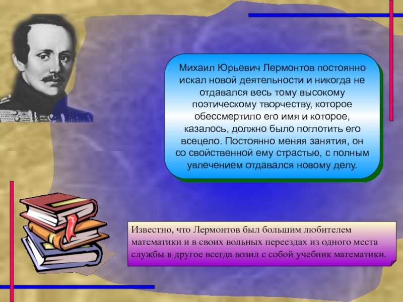 Известно, что Лермонтов был большим любителем математики и в своих вольных переездах из одного места службы в другое всегда возил с собой учебник математики.