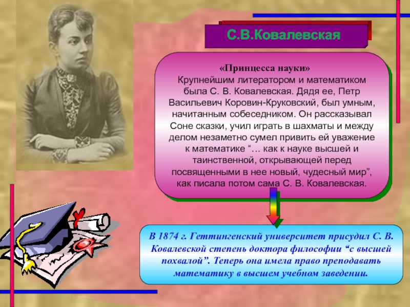 В 1874 г. Геттингенский университет присудил С. В. Ковалевской степень доктора философии “с высшей похвалой”. Теперь она имела право преподавать математику в высшем учебном заведении.
