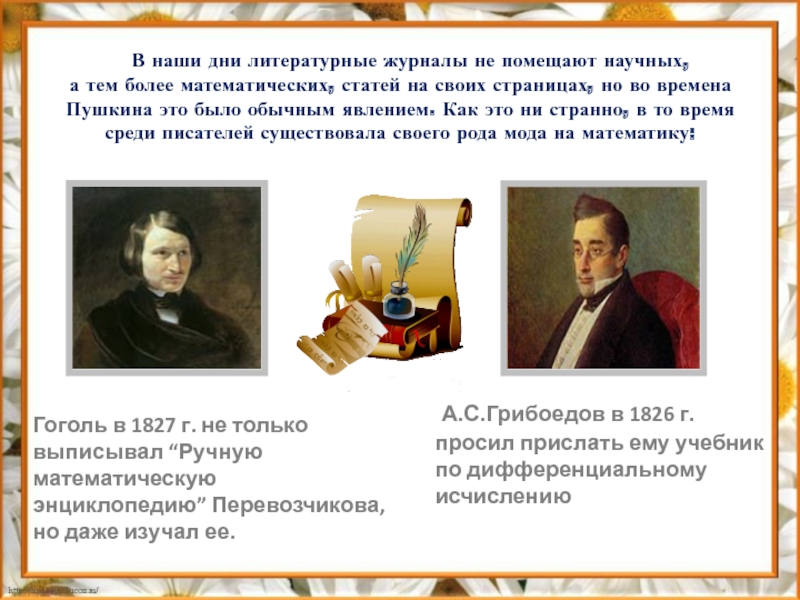 Гоголь в 1827 г. не только выписывал “Ручную математическую энциклопедию” Перевозчикова, но даже изучал ее.