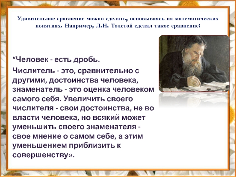 Числитель - это, сравнительно с другими, достоинства человека, знаменатель - это оценка человеком самого себя. Увеличить своего числителя - свои достоинства, не во власти человека, но всякий может уменьшить своего знаменателя - свое мнение о самом себе, а этим уменьшением приблизить к совершенству».
