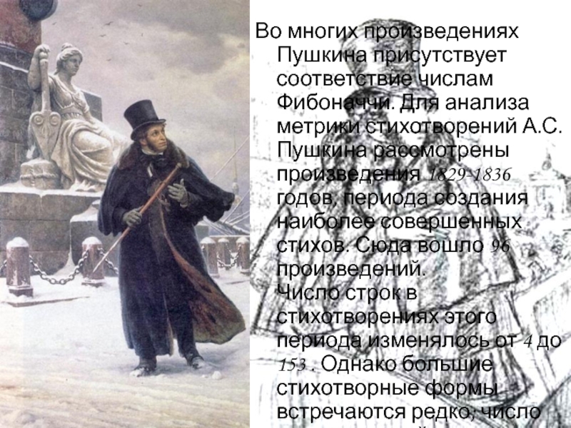 Слайд 11Во многих произведениях Пушкина присутствует соответствие числам Фибоначчи. Для анализа метрики