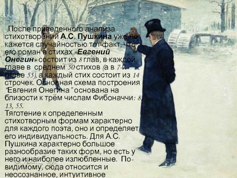 А.С. Пушкина уже не кажется случайностью тот факт, что его роман в стихах «Евгений Онегин» состоит из 8 глав, в каждой главе в среднем 50 стихов (а в 7-й главе 55), а каждый стих состоит из 14 строчек. Основная схема построения “Евгения Онегина” основана на близости к трём числам Фибоначчи: 8, 13, 55.
