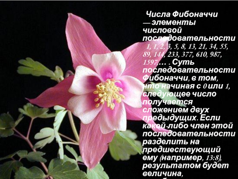 5, 8, 13, 21, 34, 55, 89, 144, 233, 377, 610, 987, 1597,… . Суть последовательности Фибоначчи, в том, что начиная с 0 или 1, следующее число получается сложением двух предыдущих. Если какой-либо член этой последовательности разделить на предшествующий ему (например, 13:8), результатом будет величина, колеблющаяся около иррационального значения 1,618033988975… и через раз то превосходящая, то настигающая его.