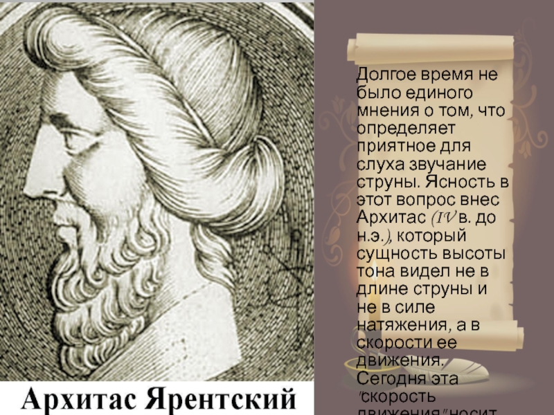 для слуха звучание струны. Ясность в этот вопрос внес Архитас (IV в. до н.э.), который сущность высоты тона видел не в длине струны и не в силе натяжения, а в скорости ее движения. Сегодня эта "скорость движения" носит название частоты колебания струны.