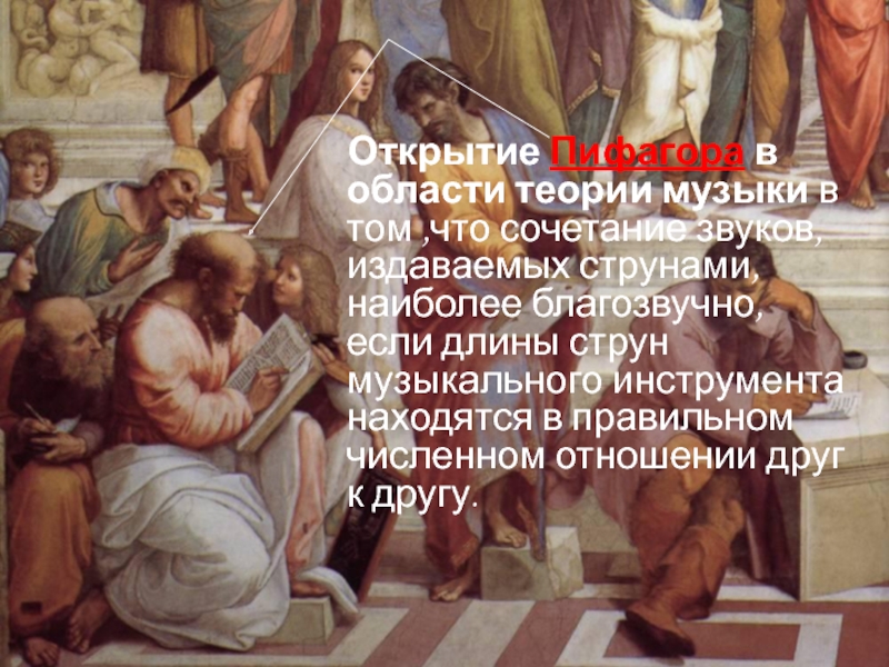 Слайд 5 Открытие Пифагора в области теории музыки в том ,что