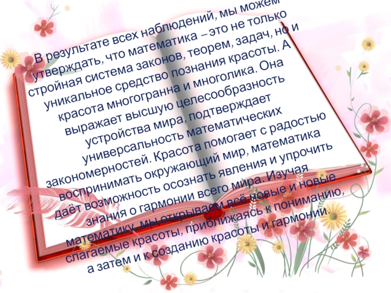 это не только стройная система законов, теорем, задач, но и уникальное средство познания красоты. А красота многогранна и многолика. Она выражает высшую целесообразность устройства мира, подтверждает универсальность математических закономерностей. Красота помогает с радостью воспринимать окружающий мир, математика даёт возможность осознать явления и упрочить знания о гармонии всего мира. Изучая математику, мы открываем всё новые и новые слагаемые красоты, приближаясь к пониманию, а затем и к созданию красоты и гармонии.