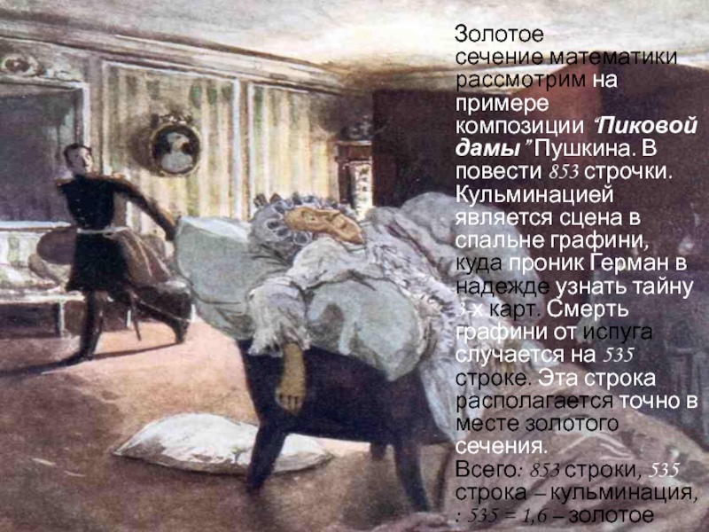 повести 853 строчки. Кульминацией является сцена в спальне графини, куда проник Герман в надежде узнать тайну 3-х карт. Смерть графини от испуга случается на 535 строке. Эта строка располагается точно в месте золотого сечения.