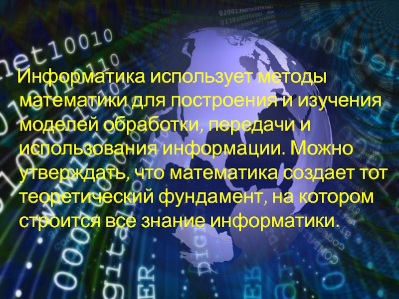 обработки, передачи и использования информации. Можно утверждать, что математика создает тот теоретический фундамент, на котором строится все знание информатики.