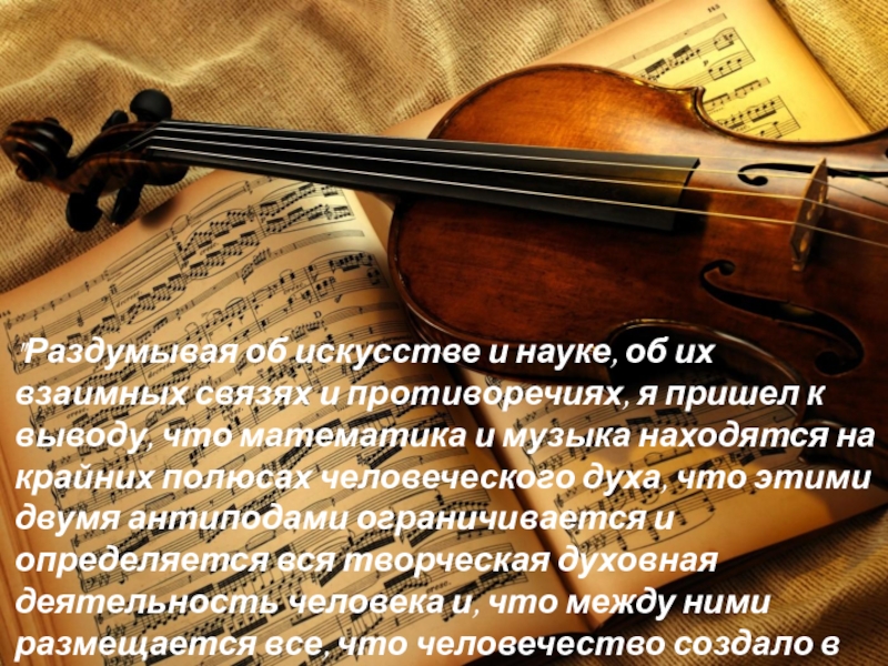 и противоречиях, я пришел к выводу, что математика и музыка находятся на крайних полюсах человеческого духа, что этими двумя антиподами ограничивается и определяется вся творческая духовная деятельность человека и, что между ними размещается все, что человечество создало в области науки и искусства"