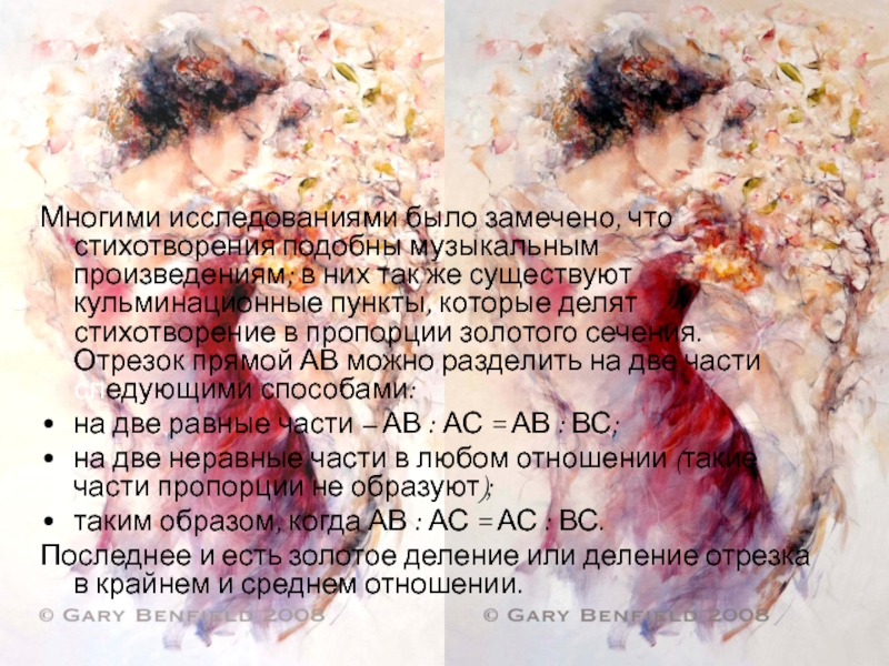 так же существуют кульминационные пункты, которые делят стихотворение в пропорции золотого сечения.