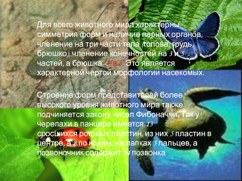 Строение форм представителей более высокого уровня животного мира также подчиняется закону чисел Фибоначчи. Так у черепахи в панцире имеется 13 сросшихся роговых пластин, из них 5 пластин в центре, а 8 по краям, на лапках 5 пальцев, а позвоночник содержит 34 позвонка