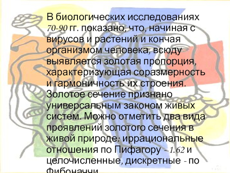 вирусов и растений и кончая организмом человека, всюду выявляется золотая пропорция, характеризующая соразмерность и гармоничность их строения. Золотое сечение признано универсальным законом живых систем. Можно отметить два вида проявлений золотого сечения в живой природе: иррациональные отношения по Пифагору - 1.62 и целочисленные, дискретные - по Фибоначчи.