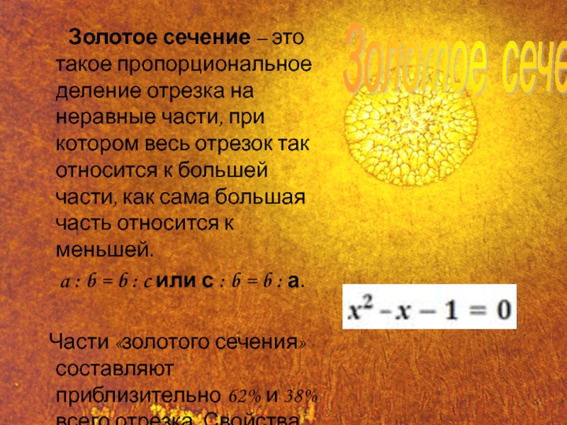 Части «золотого сечения» составляют приблизительно 62% и 38% всего отрезка. Свойства «золотого сечения» описываются уравнением: