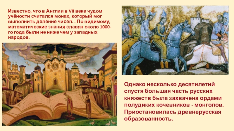 Однако несколько десятилетий спустя большая часть русских княжеств была захвачена ордами полудиких кочевников - монголов. Приостановилась древнерусская образованность.