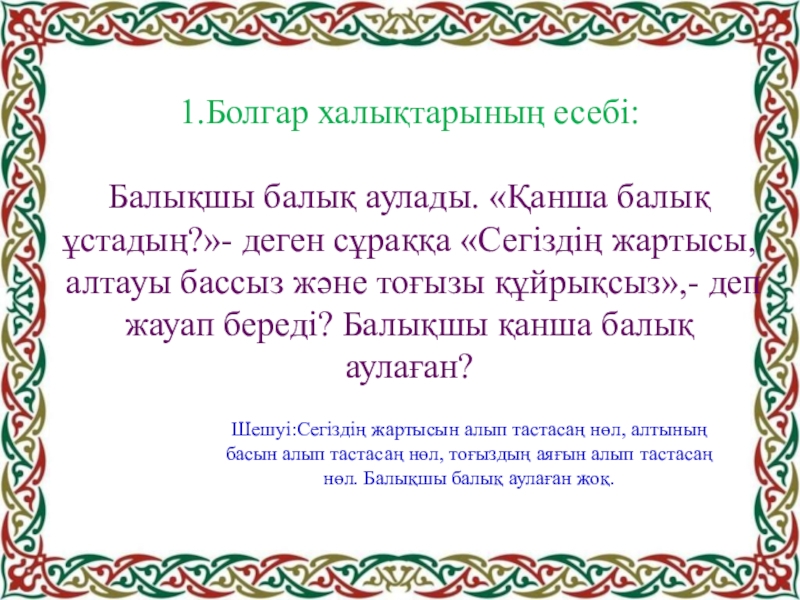 Шешуі:Сегіздің жартысын алып тастасаң нөл, алтының басын алып тастасаң нөл, тоғыздың аяғын алып тастасаң нөл. Балықшы балық аулаған жоқ.