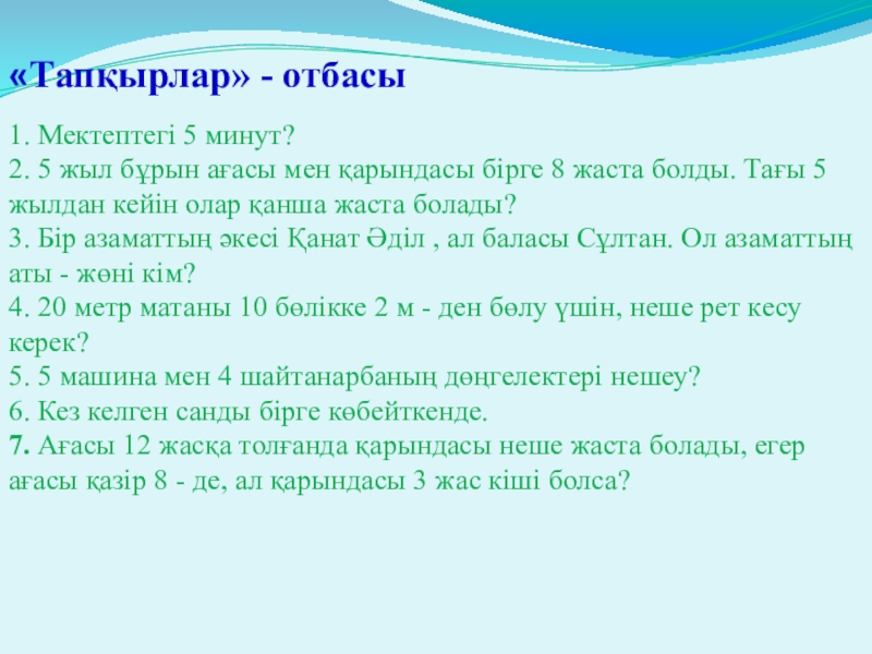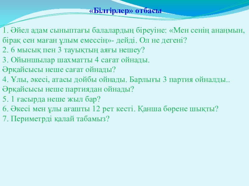Алдында 1, артында 2, алдында 2, біреуі екеуінің арасында және үшеуі бір қатарда қаз ұшып келеді. Барлығы неше қаз?