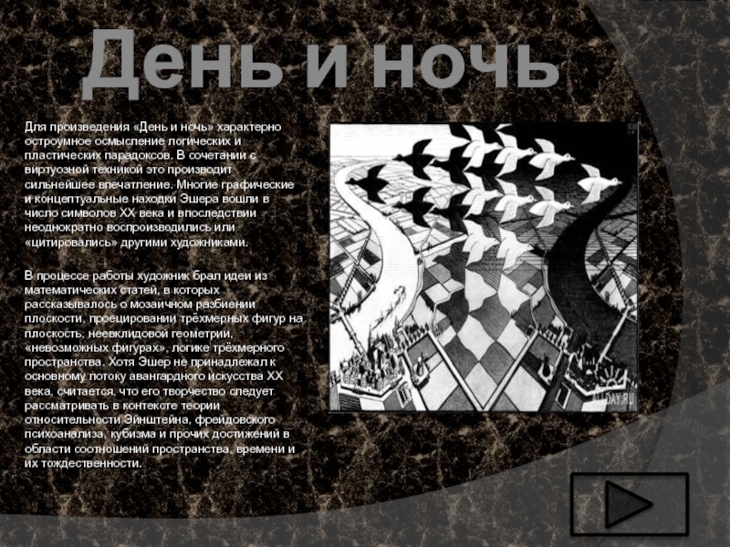 и пластических парадоксов. В сочетании с виртуозной техникой это производит сильнейшее впечатление. Многие графические и концептуальные находки Эшера вошли в число символов XX века и впоследствии неоднократно воспроизводились или «цитировались» другими художниками.