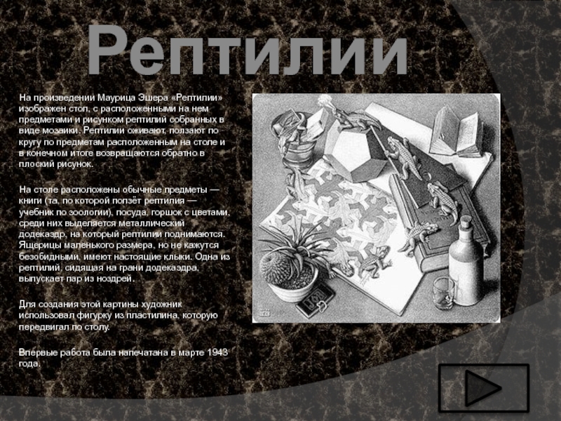 На произведении Маурица Эшера «Рептилии» изображен стол, с расположенными на нем