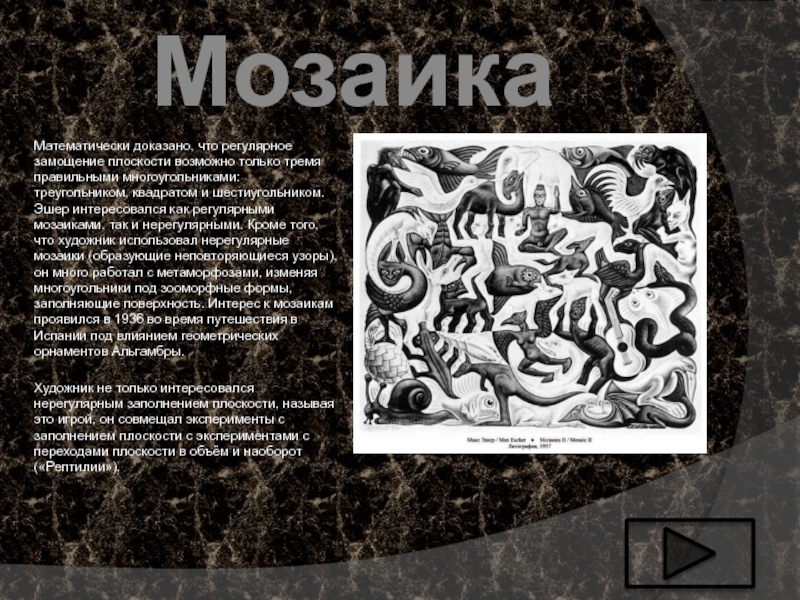треугольником, квадратом и шестиугольником. Эшер интересовался как регулярными мозаиками, так и нерегулярными. Кроме того, что художник использовал нерегулярные мозаики (образующие неповторяющиеся узоры), он много работал с метаморфозами, изменяя многоугольники под зооморфные формы, заполняющие поверхность. Интерес к мозаикам проявился в 1936 во время путешествия в Испании под влиянием геометрических орнаментов Альгамбры.