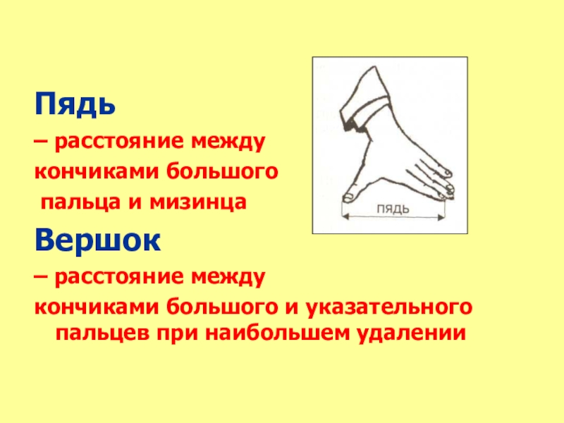 Пядь – расстояние между кончиками большого пальца и мизинцаВершок – расстояние между кончиками большого и указательного пальцев