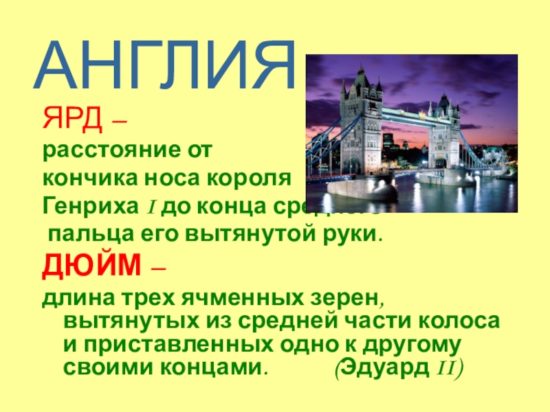 АНГЛИЯЯРД – расстояние от кончика носа короля Генриха I до конца среднего пальца его вытянутой руки.ДЮЙМ –