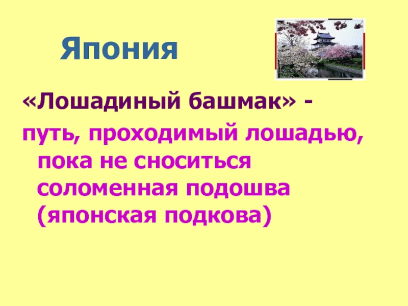 Япония«Лошадиный башмак» - путь, проходимый лошадью, пока не сноситься соломенная подошва (японская подкова)