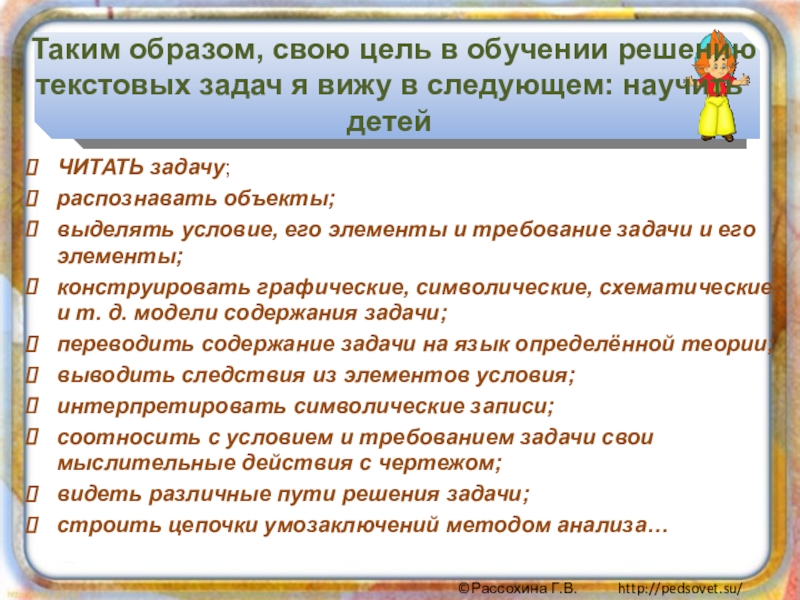 соотносить с условием и требованием задачи свои мыслительные действия с чертежом;