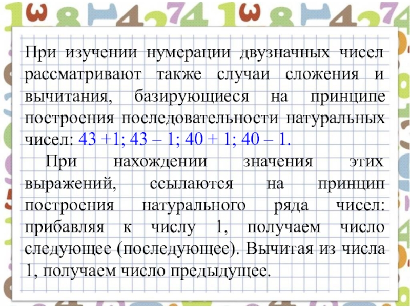 При изучении нумерации двузначных чисел рассматривают также случаи сложения и вычитания,