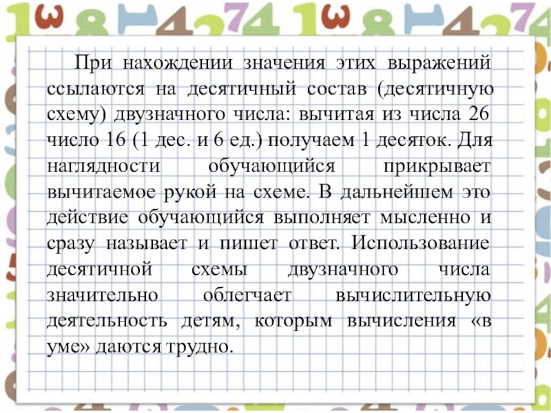 двузначного числа: вычитая из числа 26 число 16 (1 дес. и 6 ед.) получаем 1 десяток. Для наглядности обучающийся прикрывает вычитаемое рукой на схеме. В дальнейшем это действие обучающийся выполняет мысленно и сразу называет и пишет ответ. Использование десятичной схемы двузначного числа значительно облегчает вычислительную деятельность детям, которым вычисления «в уме» даются трудно.
