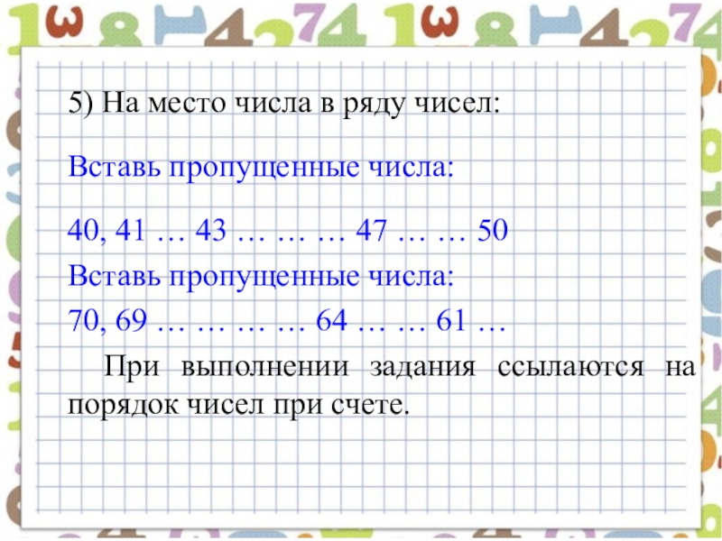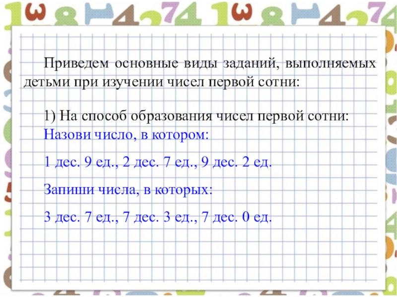 Приведем основные виды заданий, выполняемых детьми при изучении чисел первой сотни: