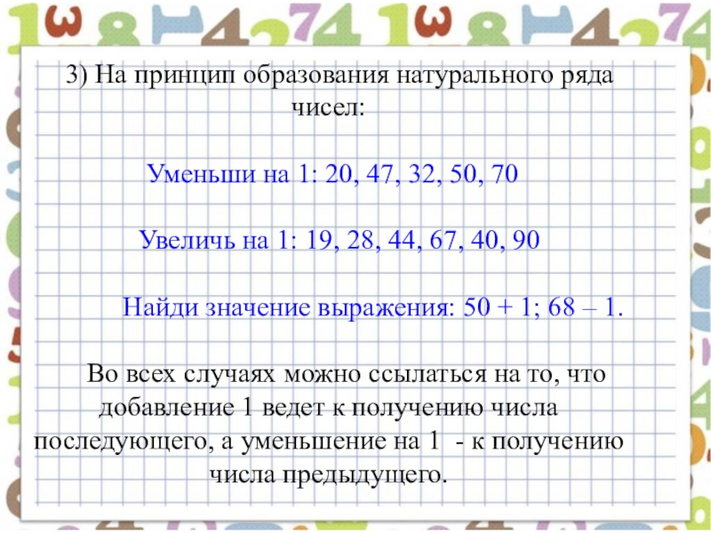 При нахождении значения этих выражений, ссылаются на принцип построения натурального ряда чисел: прибавляя к числу 1, получаем число следующее (последующее). Вычитая из числа 1, получаем число предыдущее.