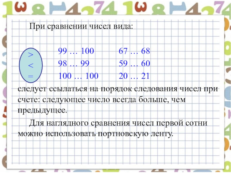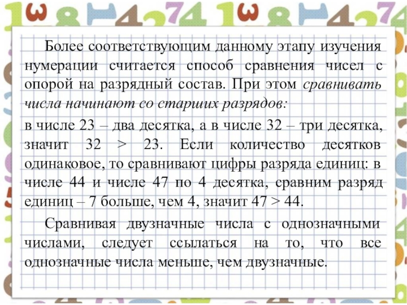 Слайд 21 Более соответствующим данному этапу изучения нумерации считается способ сравнения чисел с