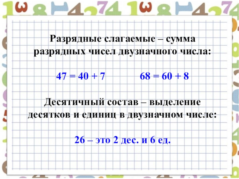 Слайд 9Разрядные слагаемые – сумма разрядных чисел двузначного числа: