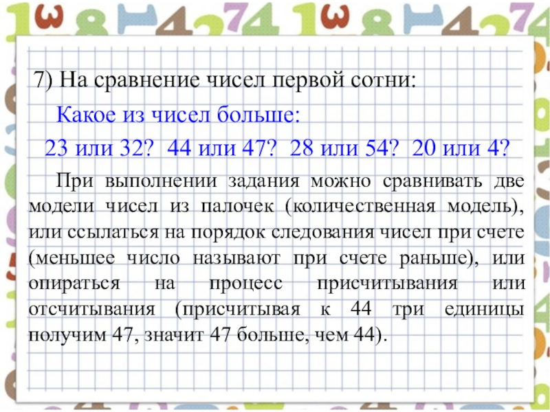 При выполнении задания можно сравнивать две модели чисел из палочек (количественная модель), или ссылаться на порядок следования чисел при счете (меньшее число называют при счете раньше), или опираться на процесс присчитывания или отсчитывания (присчитывая к 44 три единицы получим 47, значит 47 больше, чем 44).