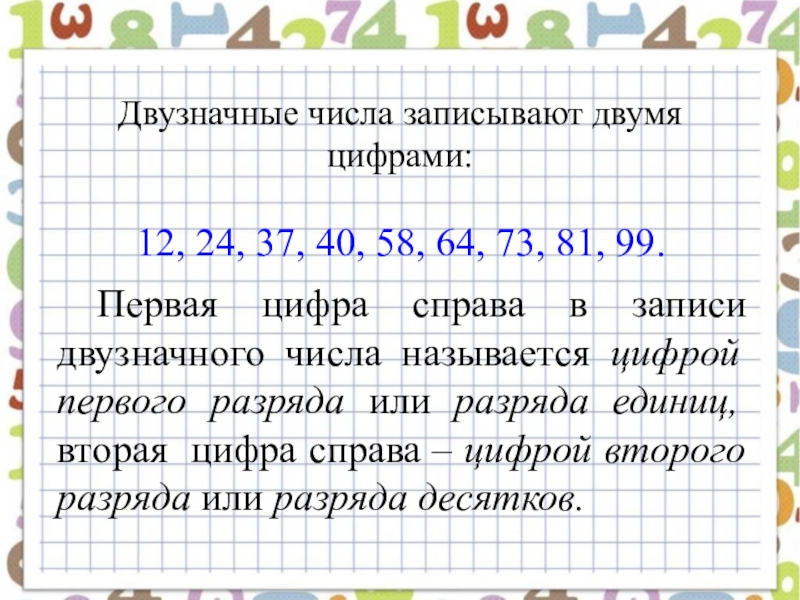 Первая цифра справа в записи двузначного числа называется цифрой первого разряда или разряда единиц, вторая цифра справа – цифрой второго разряда или разряда десятков.