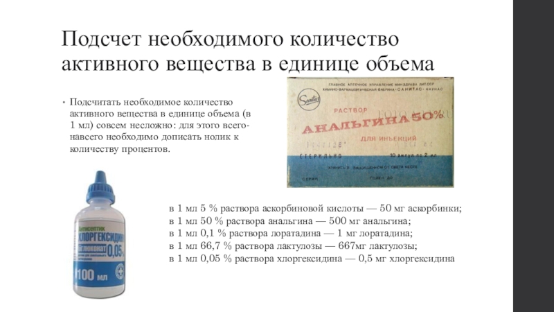 в 1 мл 50 % раствора анальгина — 500 мг анальгина;