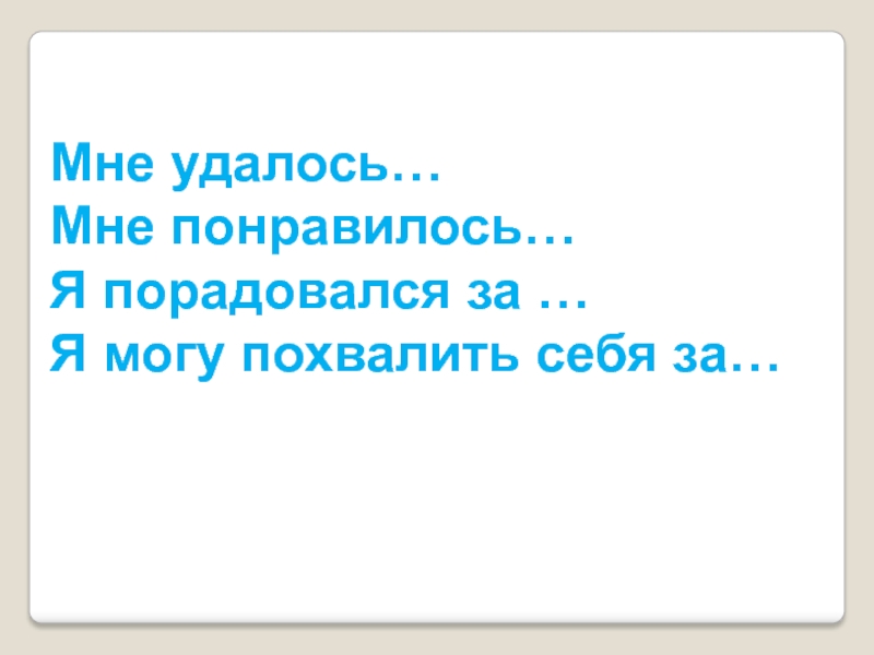 Мне удалось…Мне понравилось…Я порадовался за …Я могу похвалить себя за…