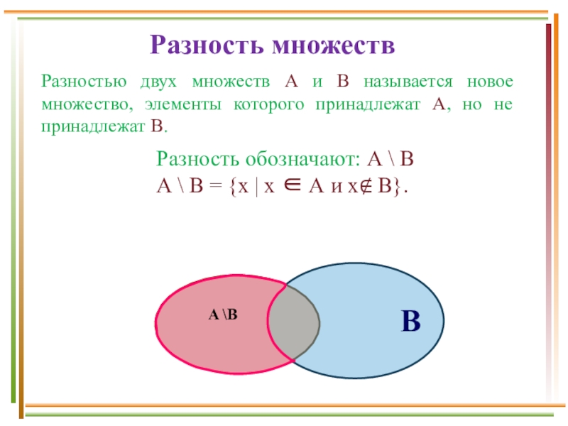 А \ В = {х | х А и х∉ В}.