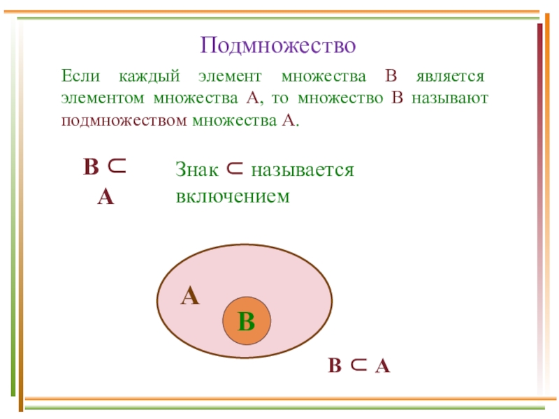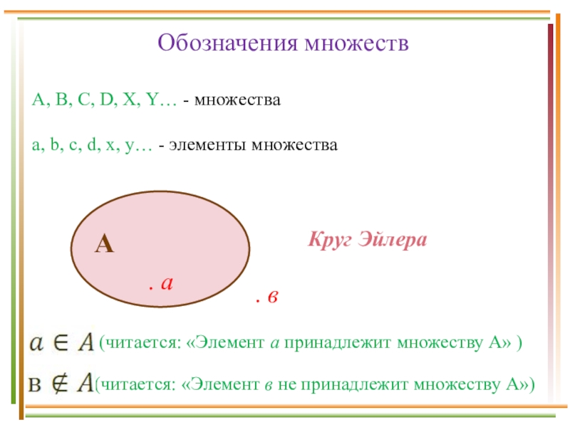(читается: «Элемент в не принадлежит множеству А»)