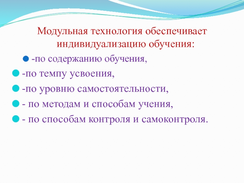 Модульная технология обеспечивает индивидуализацию обучения: -по содержанию обучения, -по темпу усвоения, -по уровню самостоятельности,- по методам и