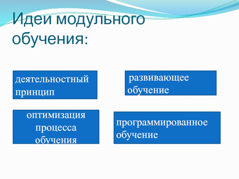 Идеи модульного обучения:  деятельностный принцип развивающее обучениепрограммированное обучениеоптимизация процесса обучения