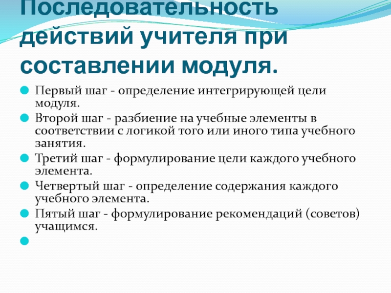 Слайд 9Последовательность действий учителя при составлении модуля.