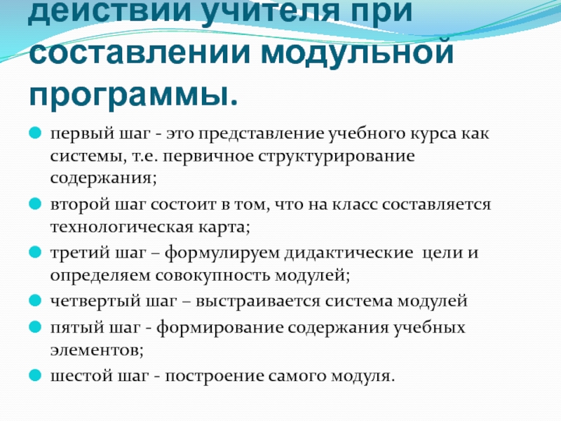 Слайд 8Последовательность действий учителя при составлении модульной программы.